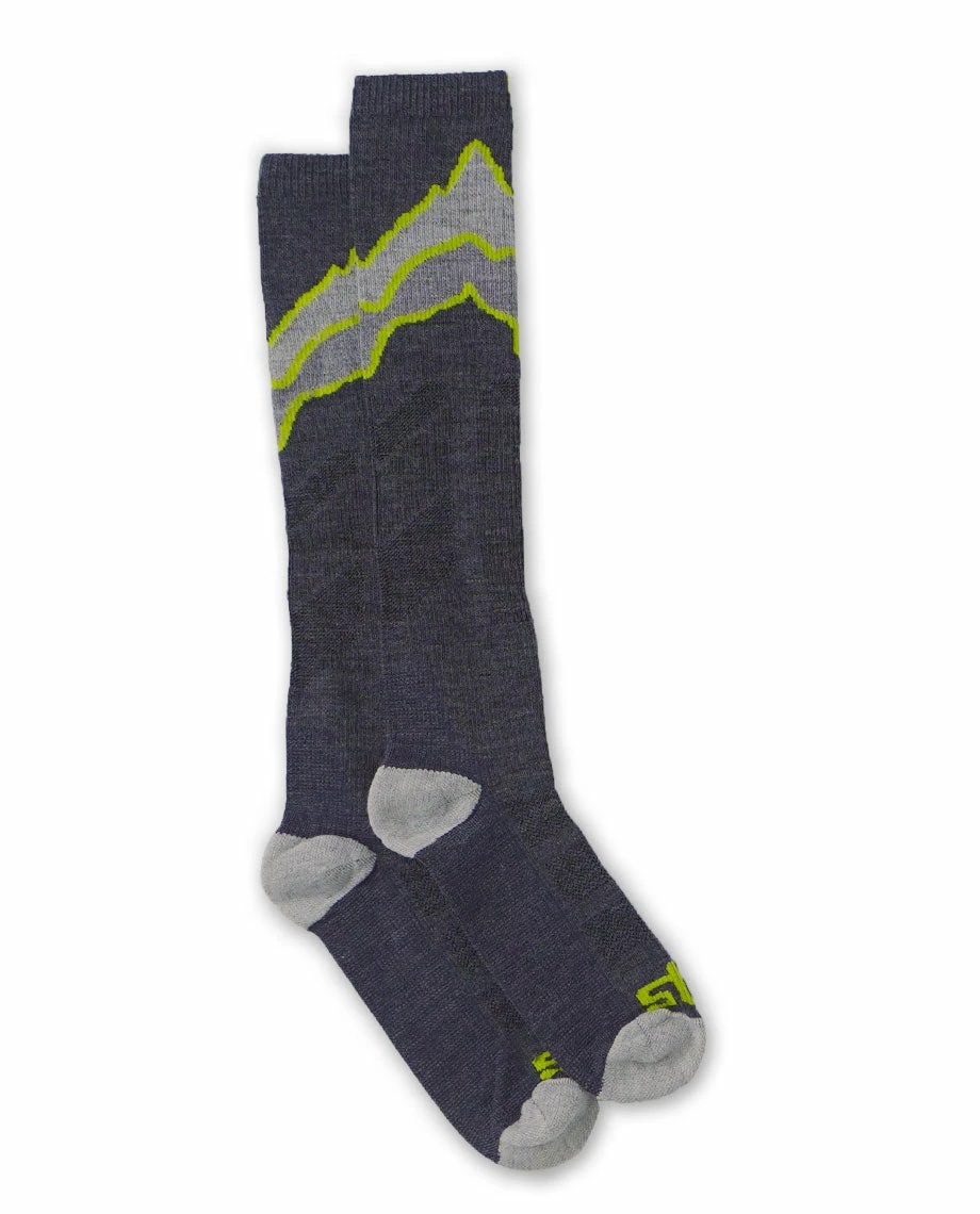 Big mountain skiers get specific about boot fit. That’s why our lightweight, thin wool blend sock is streamlined to save on volume, enabling a performance Dynafit or DIN sole fit. Slight, comfort compression fights vertical fatigue, while the merino/nylon/spandex blend wicks and warms when skiing tough or skinning far. Low profile instep, minimal padding and big mountain horizon pattern give that extra shot of booting up motivation.